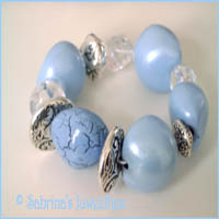 Lichtblauwe lumbanzaden voorzien van een parelmoerglansje. Tevens is gebruik gemaakt van drie soorten metalen spacers en transparante kralen. De armband is geregen op elastiek.
