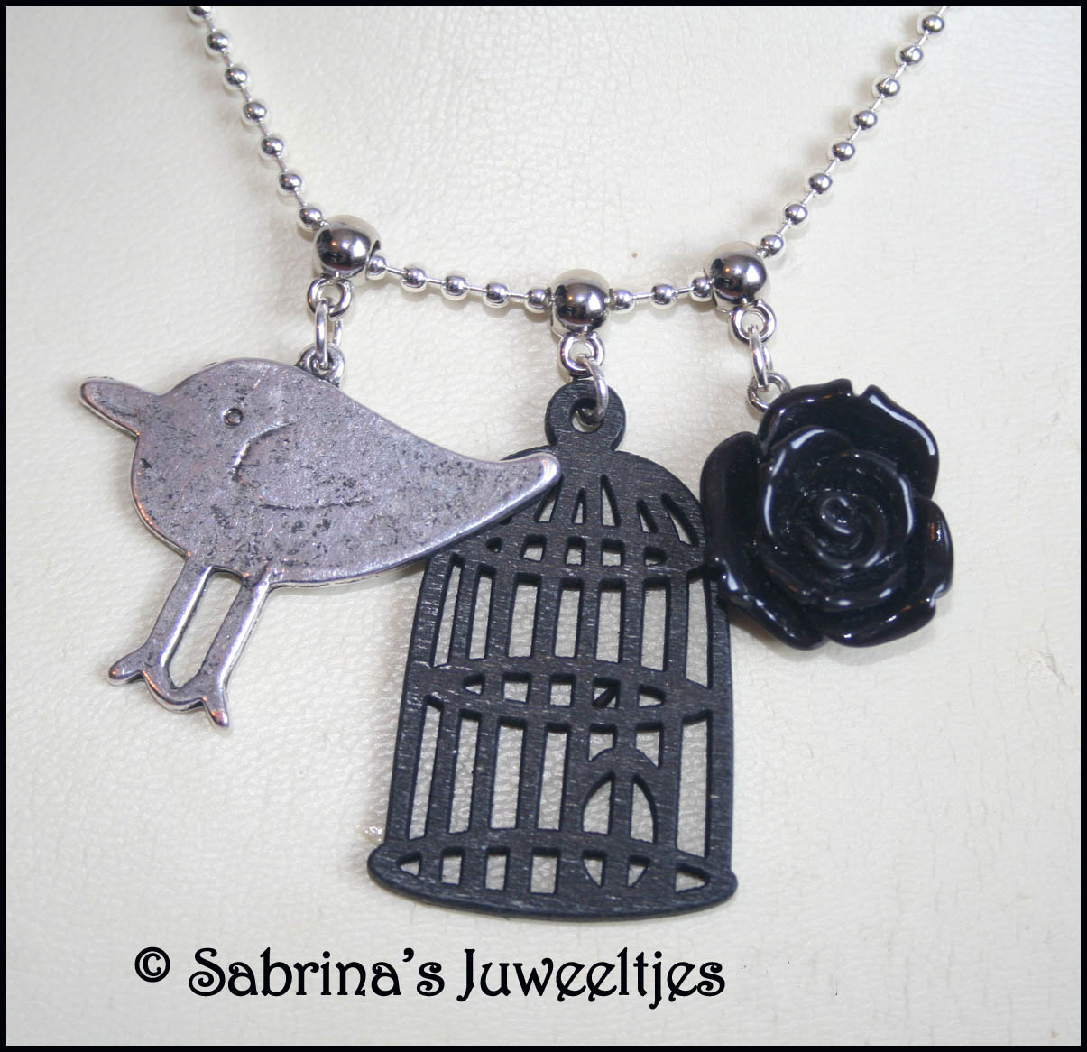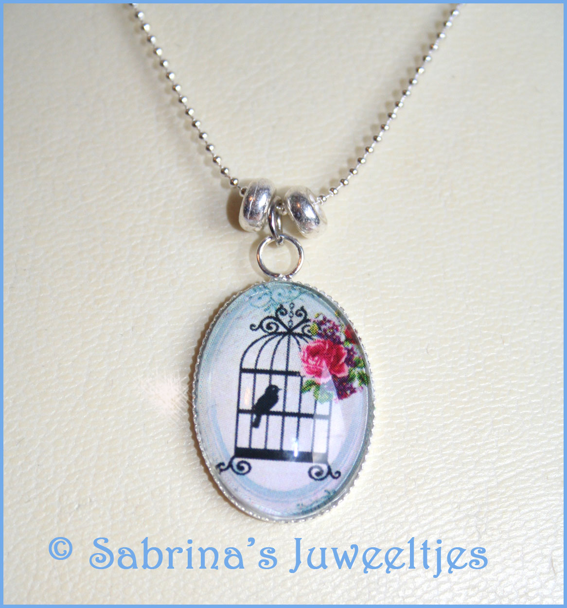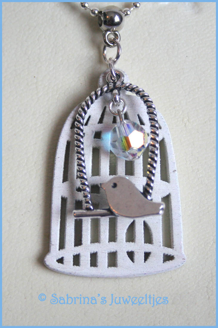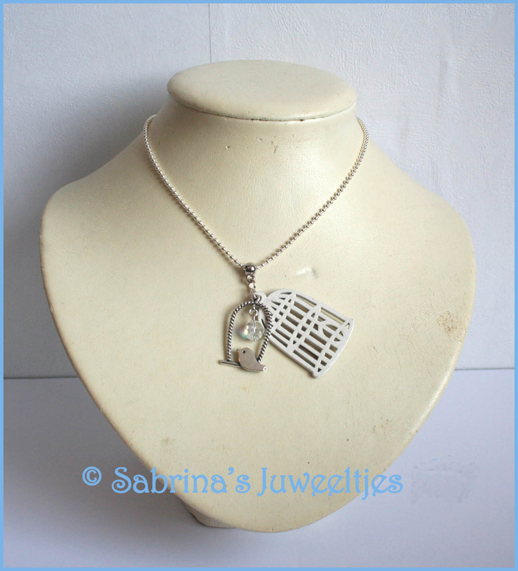 vogelkooi hangt aan een zilverkleurige ballchain ketting.